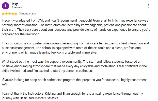 AVI Career Training was established in 1985 with over 30 years of experience in Esthetics, Master Esthetics, Electrolysis, Cosmetology, Massage Therapy and Instructor-Cosmetology, Instructor-Esthetics and more